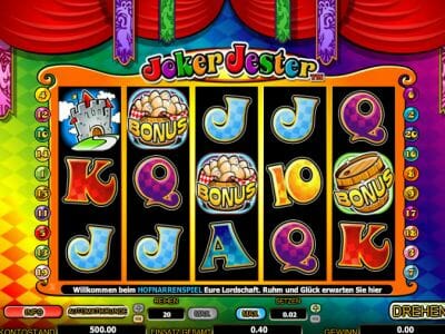 Beim Spielautomaten Joker Jester scheint das Wild gewissermaßen die Hauptrolle zu übernehmen. Gemeint ist hier jedoch der Hofnarr. Entsprechend befinden wir uns an einem mittelalterlichen Hof. Hier gilt es die Massen in der Burg zu unterhalten. Die Wände der Burg oder hier des Automatenspiels sind mit Wimpeln geschmückt. Es herrscht eine bunte Atmosphäre, wie sie zu einem Harlekin passt. Allerdings scheint das Leben als Hofnarr erträglicher gewesen zu sein, als viele denken. Denn in diesem Slot-Game kann sehr gut abgeräumt werden.