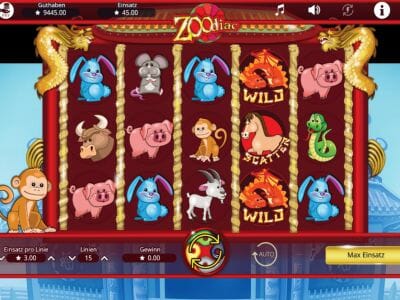 Der Zoodiac Spielautomat ist sicherlich keine Anspielung auf den Film mit ähnlichen Namen, wohl aber auf das Tierkreiszeichen. Denn immerhin nehmen Tiere die Hauptrolle in diesem Slot-Spiel ein. Dies wird sofort deutlich, wenn der Automat gestartet wird. Ein Affe hockt am Rand und schaut sich das Spektakel auf den Walzen aufmerksam an. Außerdem fällt von Beginn an die entspannte Atmosphäre auf. Eine nette Melodie umrahmt das Spiel, welches natürlich kostenfrei bei uns ausprobiert werden kann.
